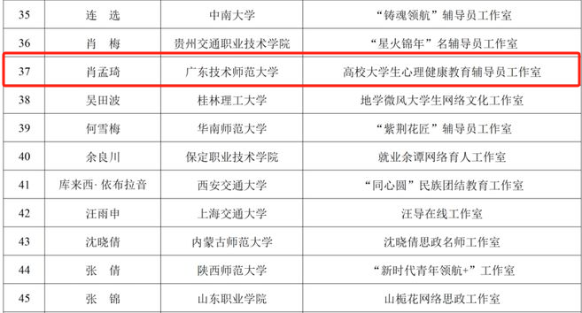 近日,教育部办公厅公布《2024年度高校思想政治工作质量提升综合改革与精品建设项目入选名单》,经组织推荐、资格审核、专家遴选、网络公示,太阳集团“高校大学生心理健康教育辅导员工作室”作为全国80个项目之一入选了2024年度高校辅导员名师工作室。
