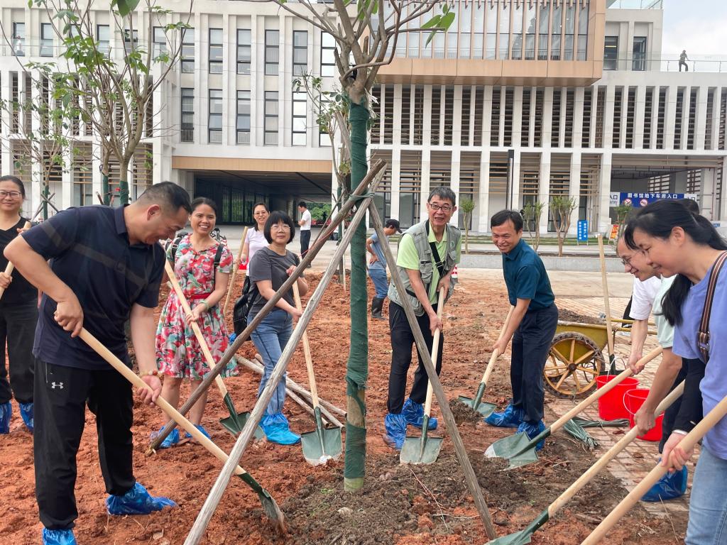 在校友广场东边的东湖西北面捐赠种植紫花风铃活动现场,在邓文新带领下,校友们热情高涨,共同为16棵象征着母校与校友之间深厚情谊的紫花风铃木(紫绣球)扶直、培土和浇水,在挥锹铲土为校园增添绿美中,不仅厚植了校友情、母校情,也植树植未来,寓意着师生校友对学校发展未来的美好期许。
