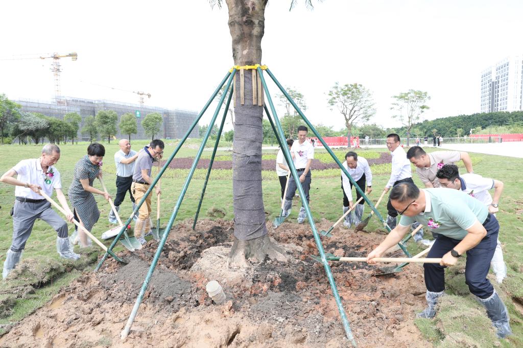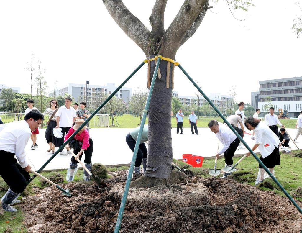 为更好推进“绿美广东”建设,打造绿美校园,为学校博士授予单位申报和高质量发展营造更好的“绿美”育人环境,同时打造一方可以更好承载校友情感的精神家园,在广大校友、离退休老领导老教师、在校师生员工以及社会各界的大力支持下,在学校领导的关心指导和学校校友会的精心统筹组织下,从去年7月至今年4月,学校先后启动了校友广场和校友林基金项目建设,得到各界热烈反响。当前,这两个项目圆满完成了阶段性目标。5月30日,广州校友联络处主任、1979级政治系校友丁锦文等38名校友代表回母校参加了校友广场校友林捐赠植树活动。学校校长戴青云,党委副书记李向明,副校长黄秋文、孙燕青、邓文新,学校原党委书记、省政协委员凌靖波,学校原校长、佛山科学技术学院党委书记骆少明等,和校友代表一起参加了捐赠植树活动。