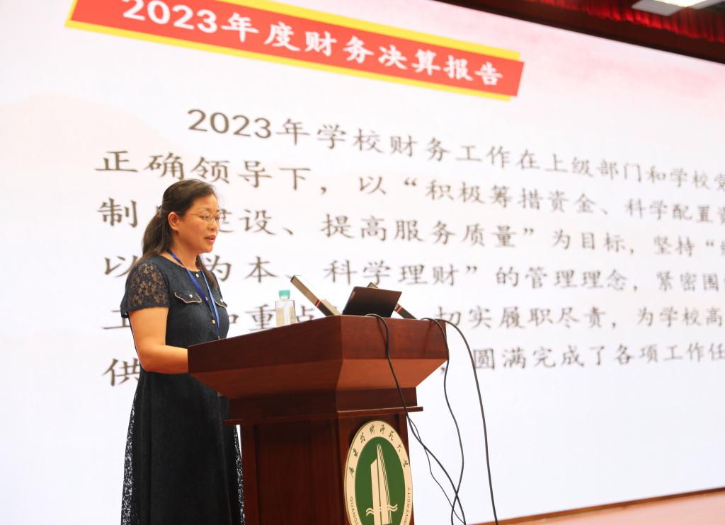 上午10:30,大会在庄严的《国歌》声中拉开帷幕。代表们听取审议了戴青云校长所作的学校工作报告,李向明副书记所作的工会工作报告,财务处处长郑萍所作的学校2023年度财务决算报告和2024年度财务预算(草案)报告,人事处处长许竹君所作的《9728太阳集团职称评审办法(2024年修订)》修订报告,听取讨论了《9728太阳集团绩效工资实施办法(2024年修订)》,书面审议了学校提案工作报告、2023年度学术委员会工作报告、工会财务工作报告。