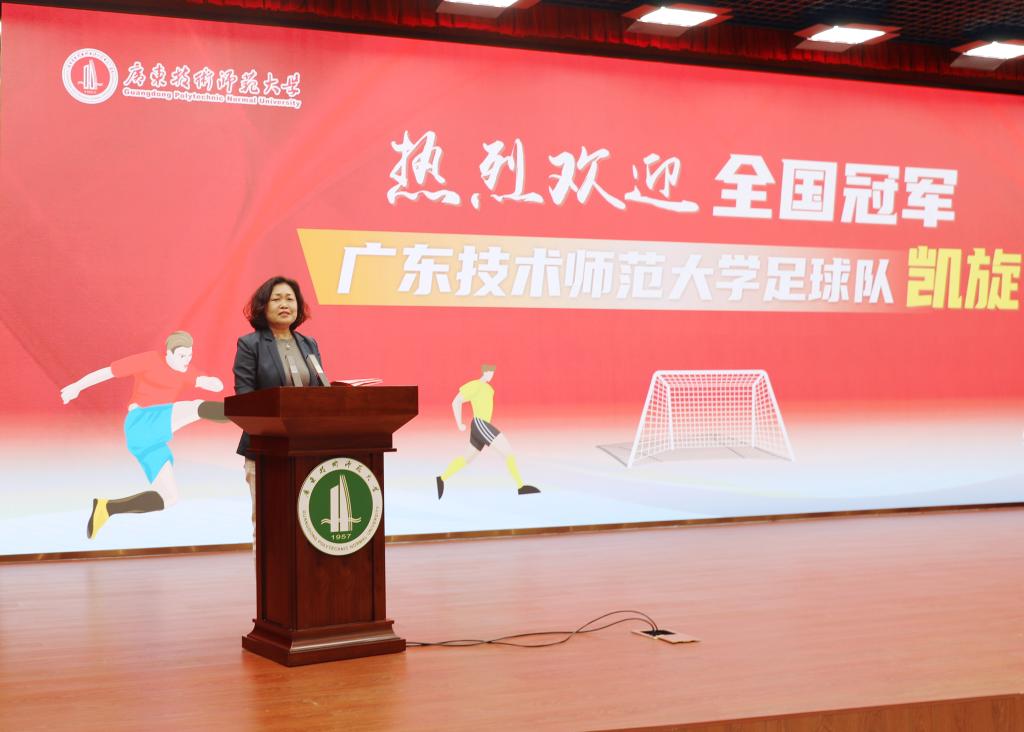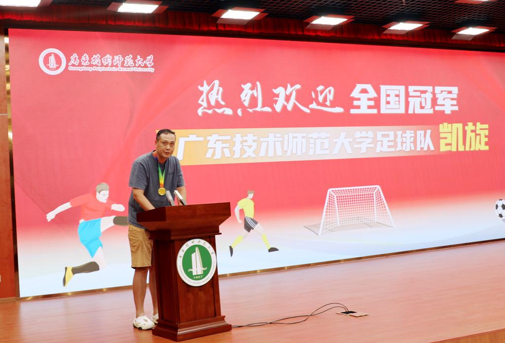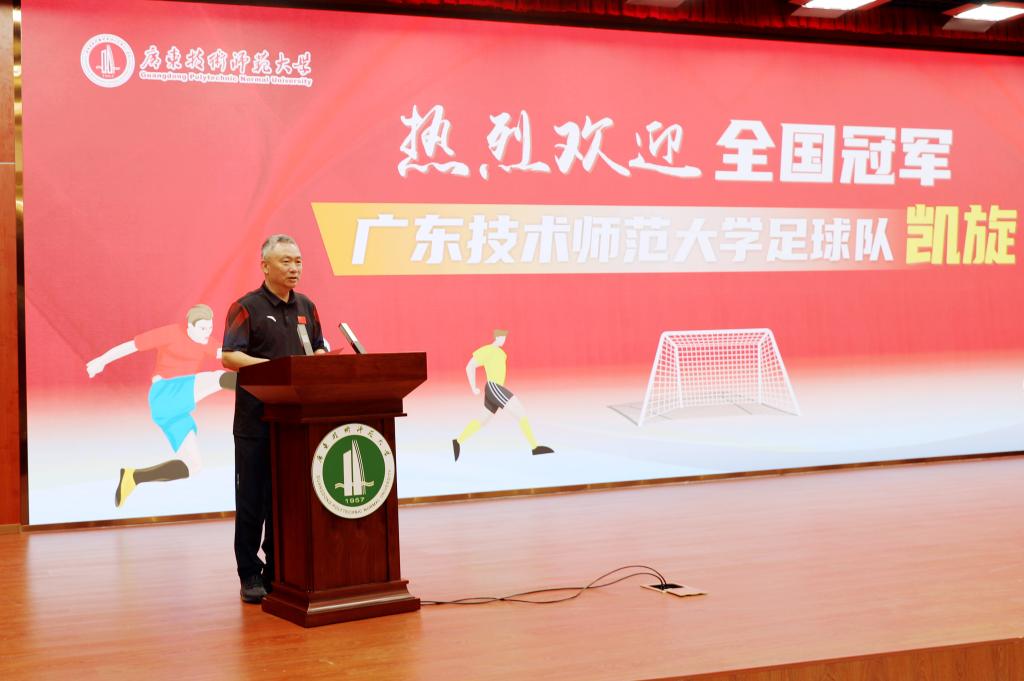 6月17日中午,广师大男足队凯旋仪式在白云校区图书馆一楼报告厅隆重举行。广东省委教育工委委员、省教育厅党组成员、副厅长程大欣,广东省体育局副厅级干部雷检军,广东省足球协会主席谢昌晶,广东省足协常务副主席兼秘书长邓欢欢,广东省足协副主席、原中国女足队员赵利红,广东省足协理事、原中国男足队员王惠良,原中国男足队员冯潇霆,省足协副秘书长邝甫祥;学校党委副书记、校长戴青云,党委副书记李向明,副校长黄秋文、苏晖、孙燕青;学校原党委书记郭斯淦,原党委副书记、校长郭杰,省政协委员、原党委书记凌靖波;学校男子足球队全体教练员、队员,学校职能部门负责人,体育与健康学院全体教师、学生代表,各学院师生代表参加仪式。