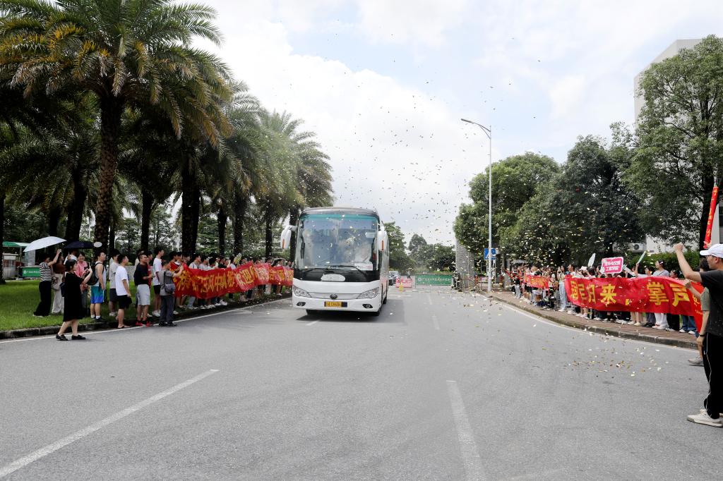 “热烈欢迎广师大男子足球队凯旋”“王者之师,胜利归来,欢迎足球英雄”“团结拼搏,勇攀高峰,荣耀归来,我们是冠军”“足球百分百,鸡腿加酸奶”,白云校区巨大的横幅热烈欢迎全国大学生足球冠军广师大男足队凯旋。