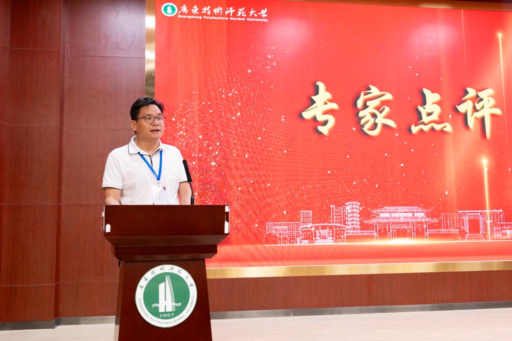 在基础教育A组,梁国彬赞扬了本次比赛是一次教学技能的高水平大赛,表扬选手们教育有情怀、思想有站位,课程设计有依据,教学有方法,源头有活水,理论有深度;也建议参赛选手要“眼中有目标,心中有学生”,“课堂要有生活,要有亮点”,要多研究课标,要多加强专业训练。