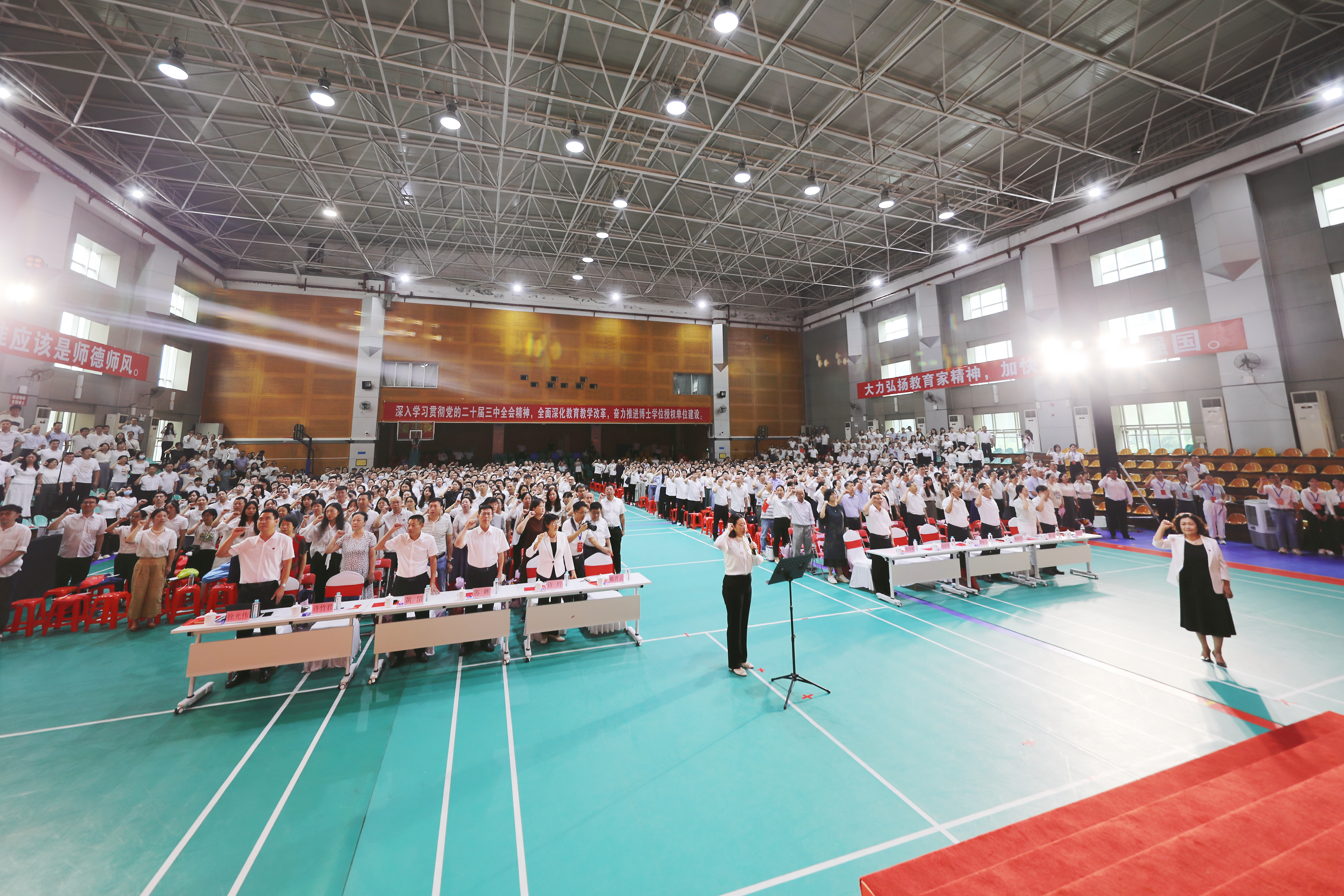 今年9月10日是我国第40个教师节。为深入贯彻落实党的二十届三中全会精神和全国教育大会精神,9月12日,学校在东校区综合馆三楼举行学习贯彻全国教育大会精神加强新时代高素质专业化教师队伍建设工作会议,进一步凝聚改革共识,激发奋进力量,激励广大教师弘扬教育家精神,紧紧围绕国家战略需求,建设高素质专业化教师队伍,全力推进博士点建设,推动学校事业高质量发展。全体校领导,各二级单位负责人,获奖教师代表、荣休教师代表、新入职教师代表和教职工代表等1500多人齐聚一堂、共庆佳节。庆祝大会以线上+线下形式进行,在河源校区设分会场。大会由副校长孙燕青主持。