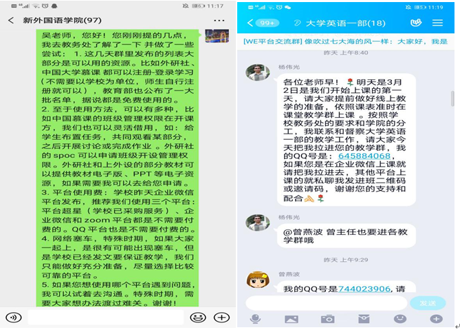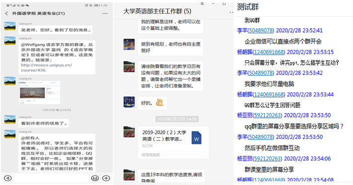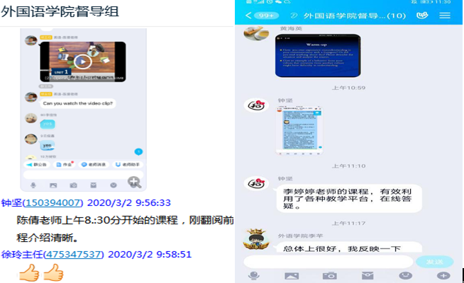 。大学英语三个部涉及的学生多班级广,仅大学英语Ⅱ一门课即覆盖98个班级,为了保证每门课每个班的每位老师都能顺利、保证质量地开展网上教学,团队采用录播线下学习+教师线上辅导的方式,并拟定了涵盖了教学具体内容和涉及的平台使用的教学日历。日语系大部分课程采用腾讯通讯工具授课,全系教师在上课前几天专门建立测试群供教师之间互相测试设备以及软件功能,积极讨论软件使用技巧以及分配方式;英语系和商务英语系教师们根据所教课程特点选用不同平台,有的教师对平台熟悉度高,结合使用QQ、腾讯会议、语音会议、超新星等平台,让课堂交流更加丰富流畅。