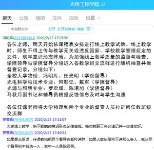 为加强线上教学质量的监督与检查,在试教前的2月23日,学院本科教学工作领导小组决定,学院领导与学院督导提前分组进入各教学班交流群进行建群指导并做好后期随机督查记录,其中罗君辉书记和陈湛旭督导进入光源与照明专业各班级课程群,何影记院长和戴军督导加入光电科学与技术专业各班级课程群,冯明库副院长和任光明督导参加全校各理工科学院大学普通物理线上教学督查。马秋月副书记和辅导员们根据反馈信息及时与学生沟通。同时强调线上教学时,师生不得上传与教学无关或违反国家、学校教学管理规定的信息,筑牢良好的意识形态阵地。
