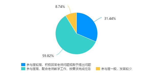 通过调查情况来看,90%以上的学生总体课堂参与度和学习状态较好、参与度都比较高,能够配合老师的教学工作,在课堂上积极回答老师提出的问题和敢于提出问题,并按老师的要求完成任务,但也存在少数学生参与度一般,发言较少。总体而言,虽受疫情影响,授课方式发生了较大变化,但是学生们还是能够自觉自主的参与课堂学习,值得肯定。