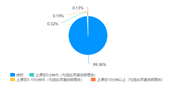 开学以来,同学们均能够按学校学院要求准时上课,能做到全勤参与网络教学,整体态度良好、有序签到、纪律优良。由以下上饼图可见99.36%的人都能按时签到,少部分人因为一些原因无法按时签到。在上课后5分钟至10分钟以内签到的主要原因是软件系统崩溃、网速慢等;而有部分同学在上课后10分钟以内仍未签到,主要原因是还不适应新型的网络授课模式,自身的学习状态尚未调整过来。此后相信财经学子会迅速适应新型授课模式。