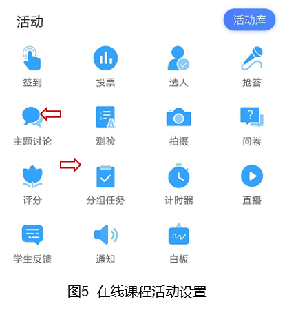 通过学习通手机端进行课程活动的设置,如图5所示,构建了教学活动的“交互性”和学生的高度“可参与性”。