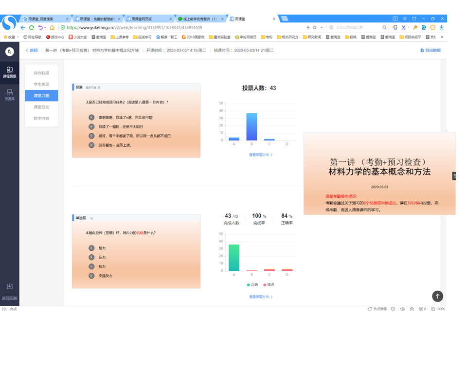 线上教学平台的选择非常重要,基于雨课堂的操作便捷、互动性好的优点和腾讯会议的稳定流畅的优势,本课程选择了“雨课堂+腾讯会议”作为主要的教学平台,并充分利用这两大平台的特点和功能,在钻研课程教学内容的基础上,根据线上教学适用进度,改进电子教案和课堂教学环节设计,力图建立一种“自学+督学”的线上课程学习模式。