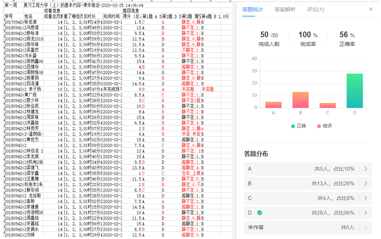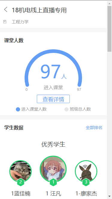 进一步地,为了便于数据追踪和班内活动组织,本课程在雨课堂中以行政小班为单位开展线上教学,学生个体表现追踪落实到各班学委和助教学生,从而避免教学大班统计中数据监督不易于落实到人等问题。