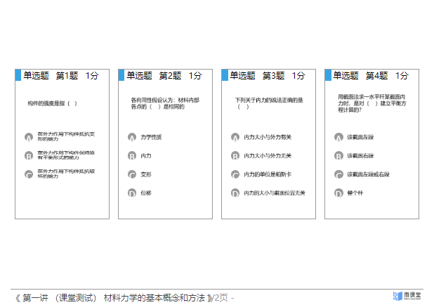 考虑到线上课堂的教学节奏难以准确掌控,本课程采用了多种形式的教学环节来调动学生的学习主动性,为每节课从预习、正课、测试、答疑设计了系列课件,预先上传资料到雨课堂,授课时会根据课堂设计进度依次发布。每一次课完整的教学环节主要包括:考勤和预习检查、音频正课、课内测试、互动交流四个环节。