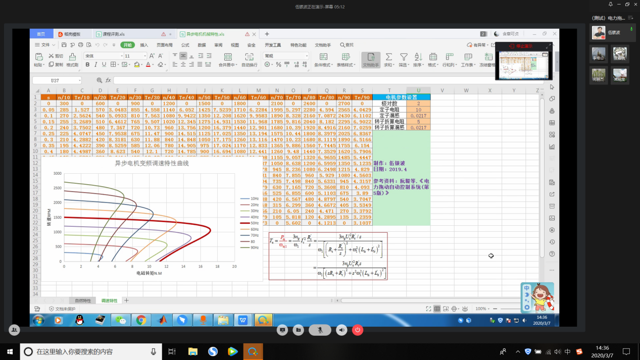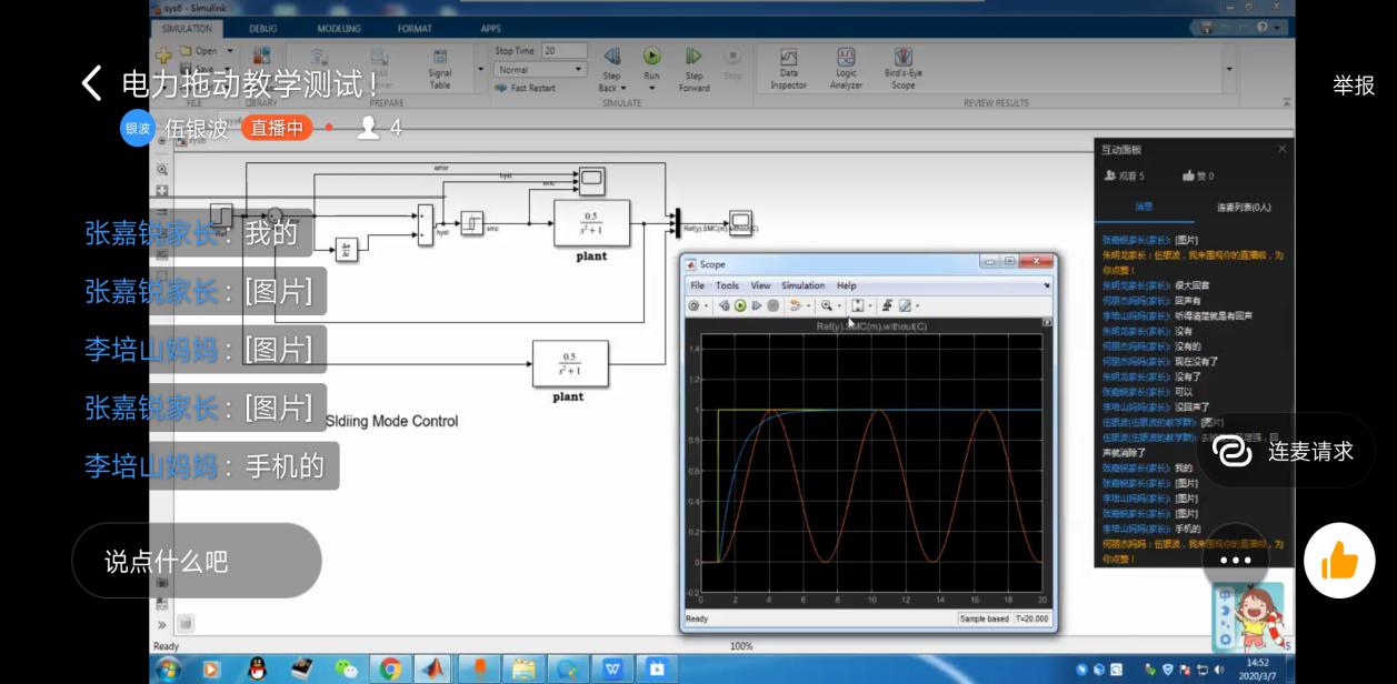 专业课程除了要进行PPT演示外,还经常需要演示视频、Excel文件、Matlab等其它各种专业软件,这时候就必须要用到屏幕分享功能了。图11是利用Excel展示异步电机机械特性的效果,图12是利用Sinmulink进行控制模型仿真演示的效果。