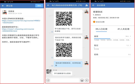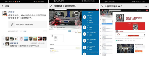 实际测试了企业微信和学习通配合的教学形式,学习通主要用于资源展示、签到、投票和讨论等教学互动;企业微信用于直播、会议讨论和答疑,能够确保线上教学质量。图6是课前引导,分别以企业微信群、微信朋友圈等形式进行宣传,图7是中国大学慕课《电力拖动自动控制系统》学习测试。