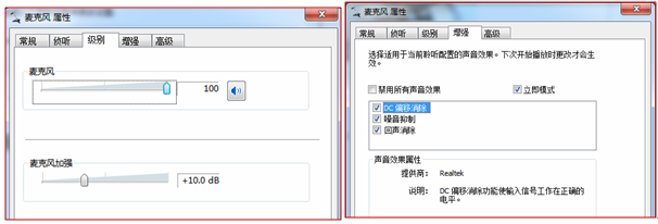 连接上麦克风后,右键任务栏声音图标,选择录音设备进行麦克风设置。如图4所示在级别选项卡中可对麦克风进行加强;在增强选项卡中勾选立即模式、DC偏移消除、噪音抑制和回声消除。