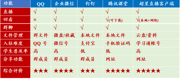 表1是对QQ、企业微信、钉钉、腾讯课堂和超星直播客户端等的详细评测结果,因为在线会议类工具大多无法进行回看,因此不适合在线教学。在表1中QQ群的直播和群课堂均不支持回看,因此不建议使用。经过实际测试,企业微信直播、钉钉、疼腾讯课堂和超星均可满足直播和回看的需求,在文件管理、注册入驻、分享等方面均可胜任。钉钉主要面向中小学,普及率和分享功能有限,也不推荐使用。企业微信直播时可分享给群成员,四星推荐。腾讯课堂和超星直播客户端均支持网址分享,而且是专业的课程直播平台,教学功能更丰富,这里进行五星推荐。