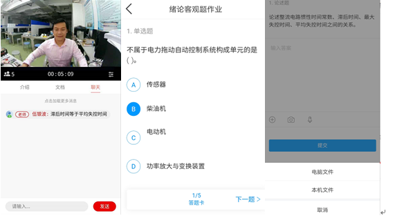 学生可以通过学习通进行观看和互动,其它人员可以通过浏览器观看教师授课情况。在直播期间,如果需要开展签到、测验、抢答等教学活动,可以用学习通对事先准备的教学活动进行发布。图10是学生端观看直播效果,以及课后作业的情况,客观题答案可直接提交,主观题可以选择以文件形式提交。