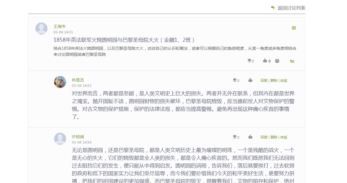 课堂讨论:任课教师根据课程内容,以及上传的章节拓展资料,设计要讨论的话题,测试学生对章节内容的了解,以及对相关知识的把握情况。