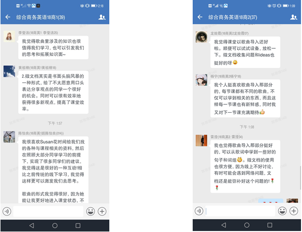 在《综合商务英语》课程线上教学改革的这三周来,课程的开展得到许多学生的学习资源的开发、积极又具有建设性反馈的分享,这些都无疑给课程后期的发展提供了物质保障和智力支持。网络时代的原住民给课程建设提供了不可或缺的生命力。