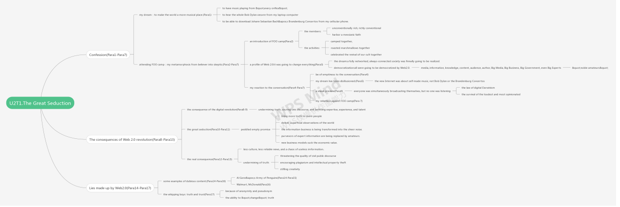 该课程教学中学生的意义建构分为学生集体的意义建构和学生个体的意义建构,前者的实现主要是上面提到的通过微文档的制作和分享及后期的讨论来实现,后者的实现是通过学生个体的思维导图的设计和微课的制作来实现的,即学生通过“学生的问题”、“案例分析”、“项目开展”或“分歧的解决”实现对整篇课文的个人总结和反思,做成思维导图,并通过英文讲解做成微课。