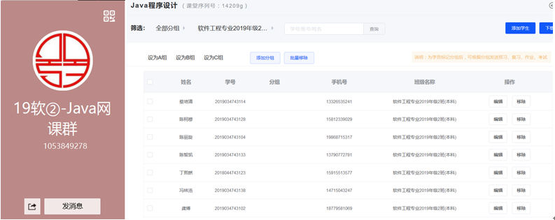 除平台的选择外,教学资源的准备也是十分重要。在开学前,通知学委创建一个属于本课程的专属QQ群,用于进行平时问题的讨论以及作业的布置;另外,在传智播客高校教辅平台上创建了属于自己的班级并将成功将全班学生信息正确导入。如下图所示: