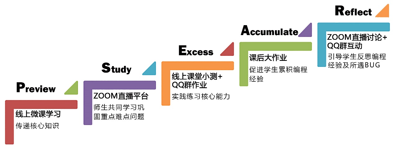 本课程教学打破了原有“以教师讲授为主,学生学与练为辅”的教学模式。整个教学过程中,教师与学生同为课程的参与者、Java语言研究的实践者,共同就“发现自身实际问题—分析问题的主要思路—探究问题解决的路径—获得问题解决的方案”为课程逻辑框架,通过“线上微课传递核心基础知识--ZOOM直播平台师生共同学习巩固重点难点问题--线上课堂小测+QQ群作业实践练习核心能力--课后大作业促进学生累积编程经验--ZOOM直播讨论+QQ群互动引导学生对编程经验与所遇BUG进行反思”这一教学模式(如下图所示),培养学生在建构教学研究能力的基础上,实现未来企业软件工程师综合实践素养的提升。