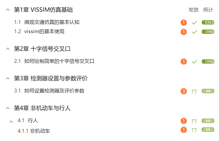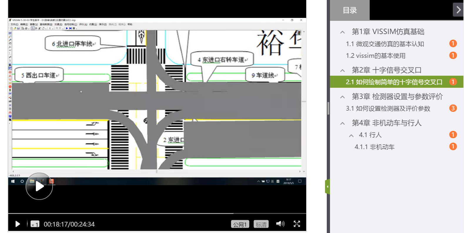 课程录播:由于软件操作步骤较为繁复,涉及到一些较细微的操作,为了学生能够更好地自主学习,授课老师提前准备了相应的VISSIM操作录播课。学生可以在直播过后,自行观看录播视频,并同步练习。录播的优点就在于学生在直播可能没看清的操作,在录播视频里可以反复观看,对于不懂的操作可以停下来研究,还可以和同学、老师讨论,便于学生学习和巩固。录播视频上传到超星平台的“章节”中并设置了闯关模式,要求学生一定要在学完上一章节的内容后才可以继续本次课程内容的学习。