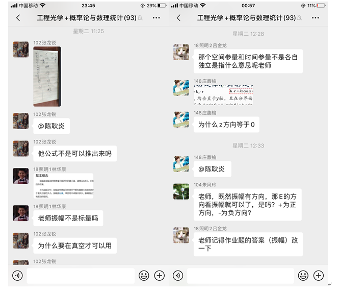 上课期间,学生有疑问的话,随时可以在腾讯会议上打开自己的麦克风提问,也可以在微信群上发图片和文字提问,任课教师都会在第一时间回答同学的提问。这就实现了实体课堂随时“举手”提问的实时交流效果。