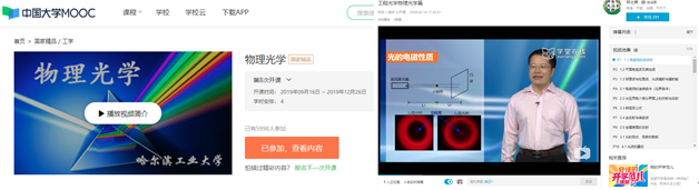 为了方便学生网上自学,任课教师在中国大学MOOC网站上挑选了哈尔滨工业大学哈斯乌力吉教授主讲的国家精品课程《物理光学》,同时也在学堂在线网站上挑选了清华大学孙利群教授等主讲的《光学工程基础》,一并推荐给学生们观看学习、拓宽知识面。