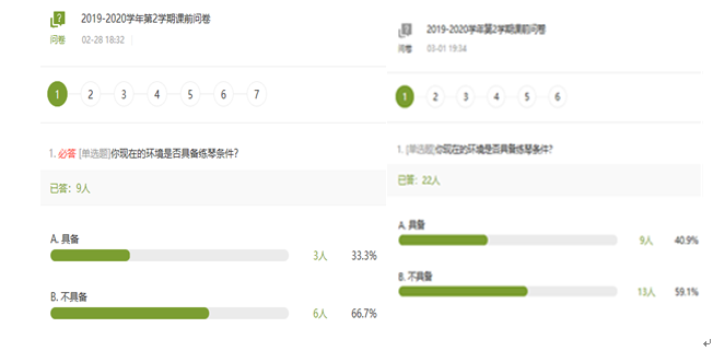 键盘乐器是学习钢琴这门课程的基本工具。如果不进行练习,学习钢琴就只能是一句空话,很难开展教学工作。在开课前,我在通过“学习通app”对本组学生进行了课前问卷调查。