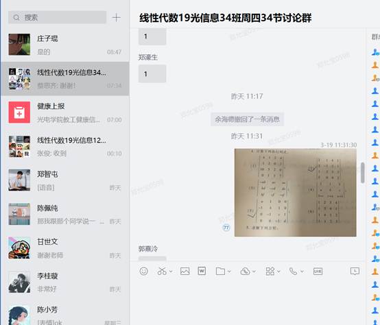 手段三:线上多手段互动,增加课堂活跃性。有任课教师上课使用的教学资源是网上国家精品课程和上课讲解答疑相结合的方式、教学平台为慕课、教学工具采用企业微信群和腾讯课堂,在线辅导答疑,在线学习讨论、在线布置作业,利用学习通抢答功能调动学生参与师生互动积极性,根据学生的不同情况采用计算机软件Matlab或者手绘的拍照等方式提交作业。