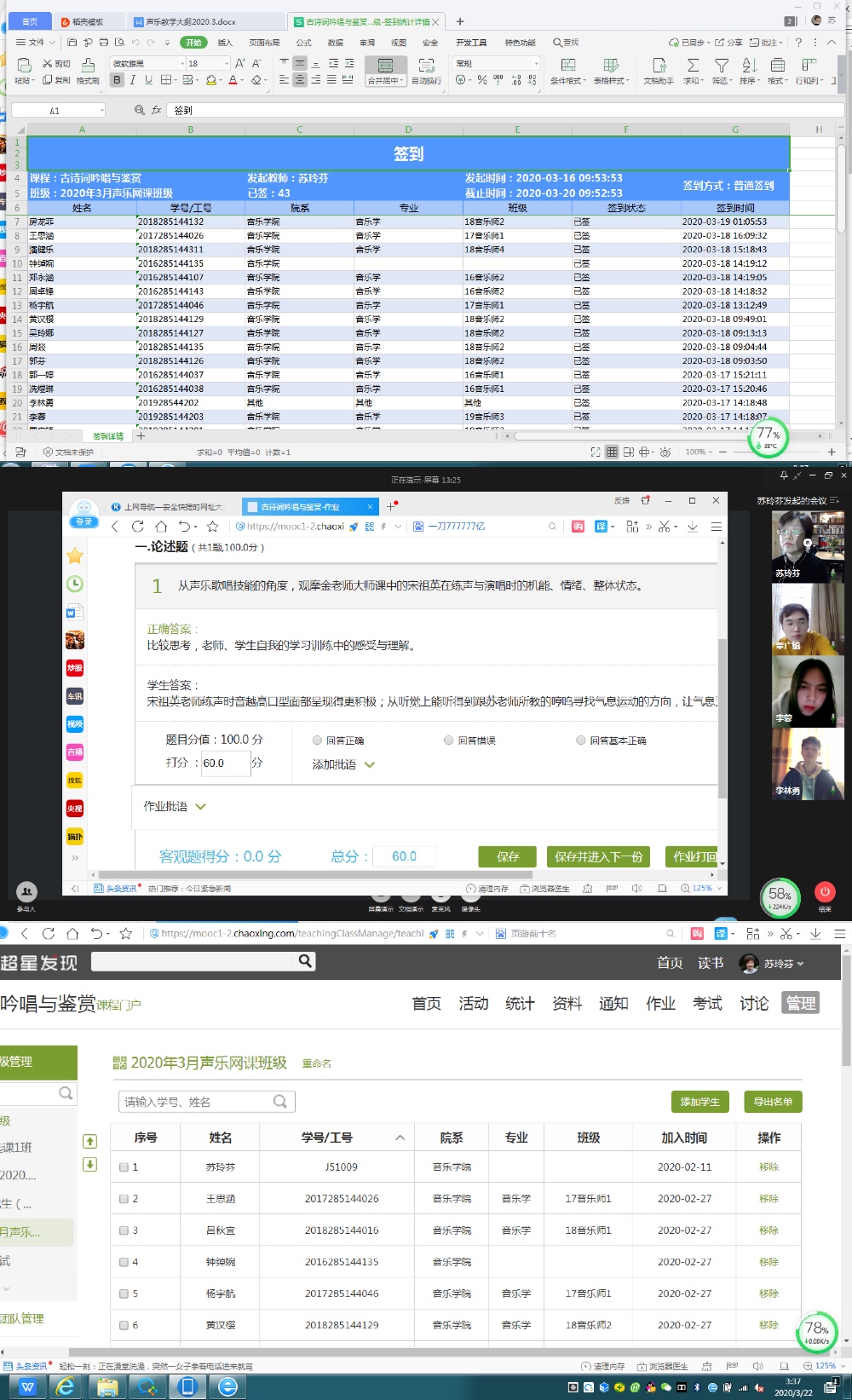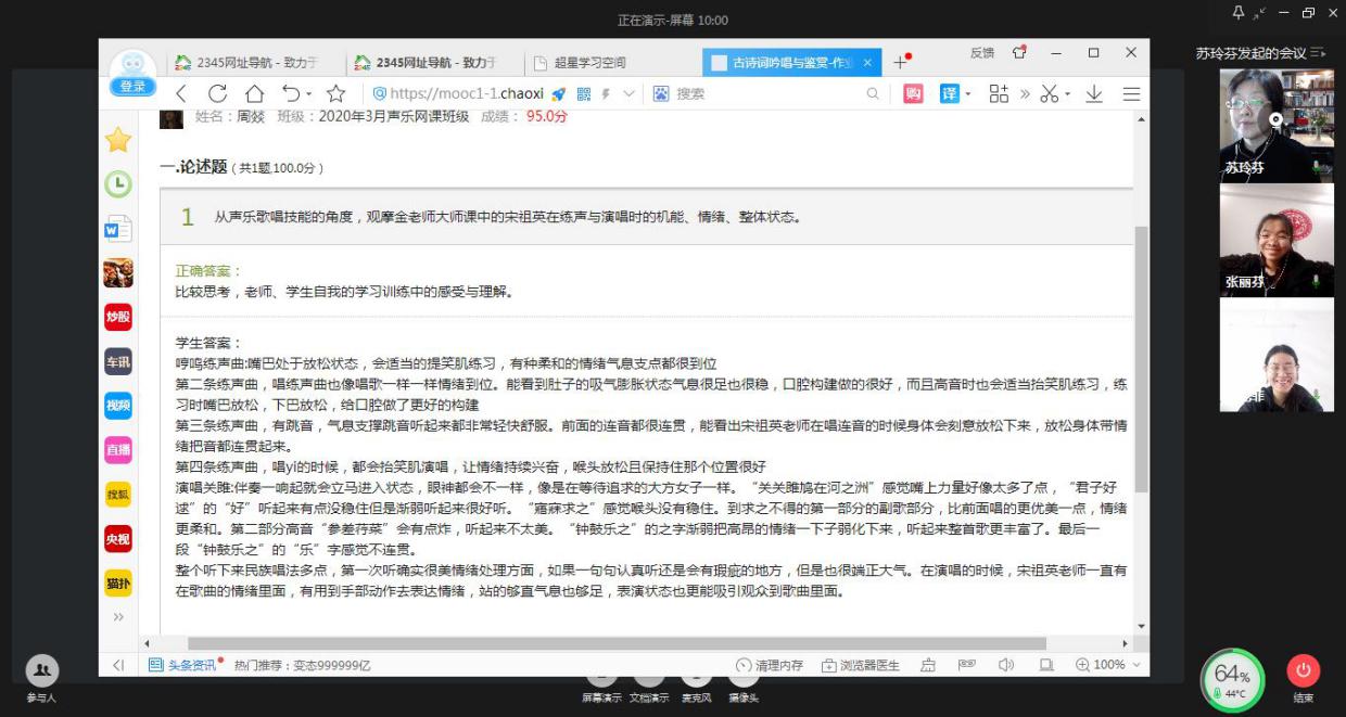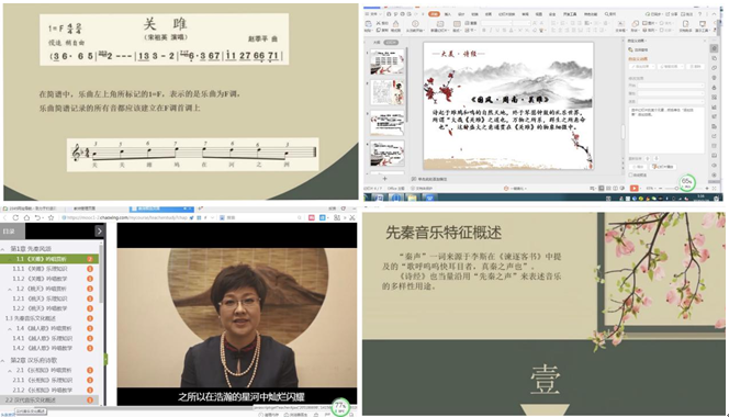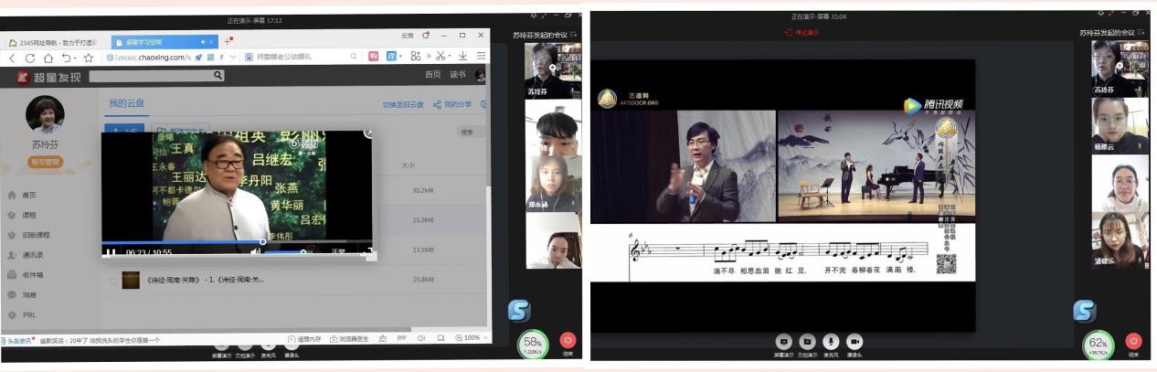 首先解决课程理论部分,以视频会议中共享电脑屏幕,在苏玲芬老师的超星学习通《古诗词吟唱与鉴赏》课程平台上,赏析课程优质视频,讲解教学PPT,完成考勤、理论作业部分的教学内容。