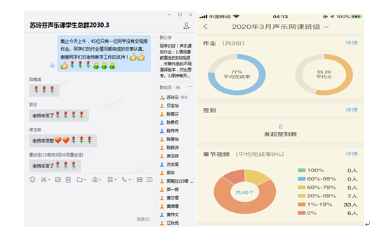 网络视频延时对课程造成困难。如何达到课堂面对面的实时分辨每位学生技能的掌握程度,老师及时纠正和正确引导学生,是音乐专业课堂的最重要的难点和重点。为解决这个问题,苏老师要求课程的45位学生在家录制练习视频,每位同学针对知识点和自己的难点完成6个视频作业,在上课前2天,发至企业微信,老师检查完成效果,借此方式来督促学生练习。这样既便于积累课堂分析案例,因材施教,又有利于督促学生在家练习和自我发现问题,大大提高学生的学习积极性和效率。