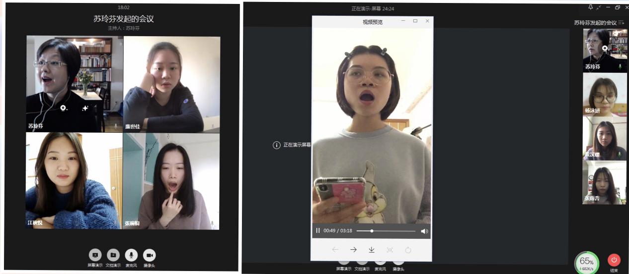 其二,《声乐课》作为一门音乐专业技能课程,需要理论与实践同步教学才能更好地完成教学任务。歌唱的机能训练实践教学通过视频会议解析学生课前录制的视频作业,及时同步纠正、示范。达到接近现场教学的实效。