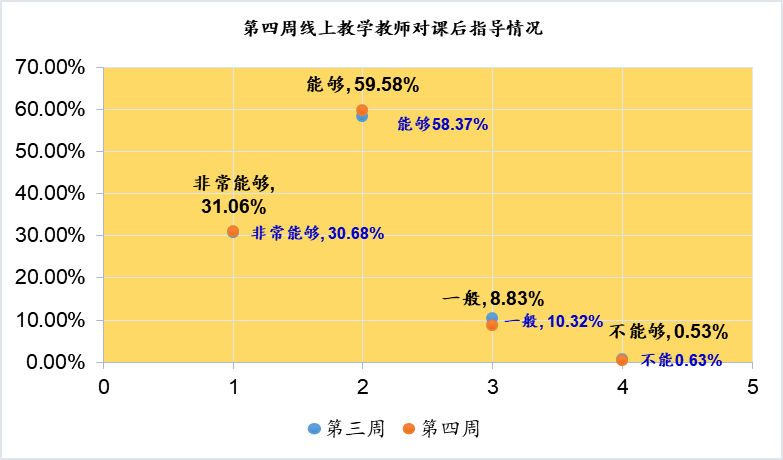 根据学生反馈数据显示(见图31),对学习内容有疑问时,90.64%的学生表示能够及时获得老师的答疑和辅导,其中31.06%的学生表示非常能够获得老师的指导,59.58%的学生表示老师基本能够进行指导,同比第三周89.05%的占比上升了1.59个百分比。大部分教师应对学生课后学习情况能够及时给予反馈,并呈现上升趋势,教学效果能够得到更好的巩固。