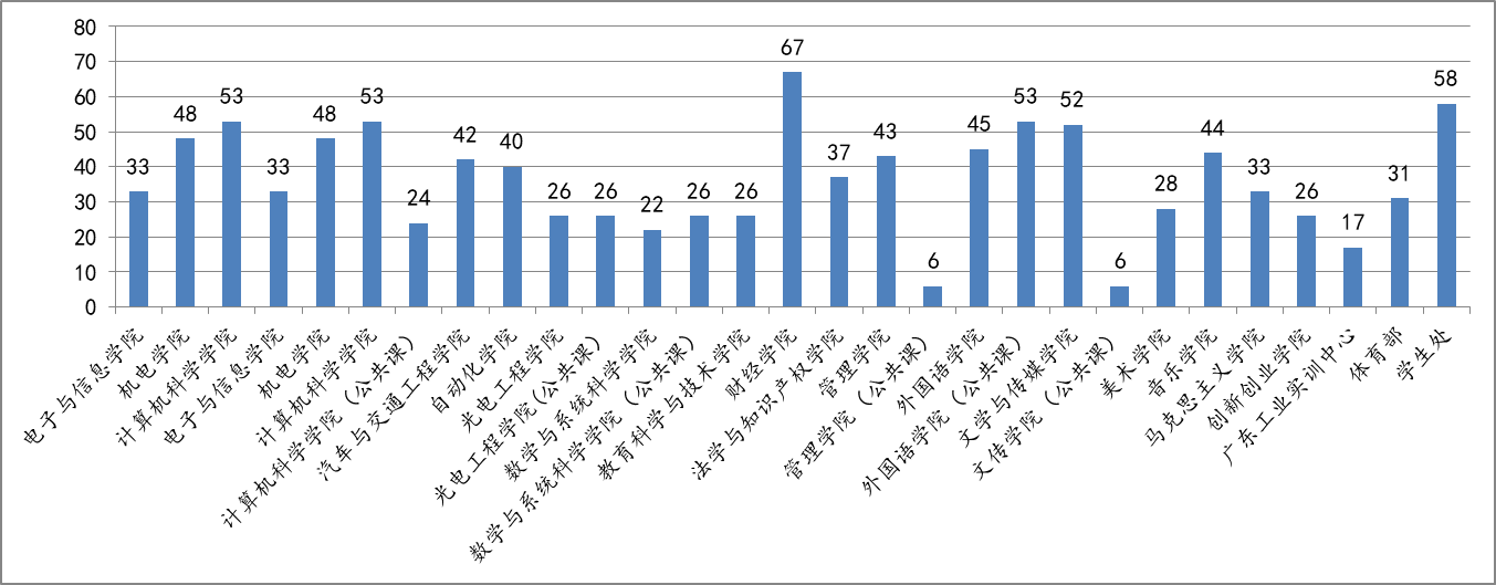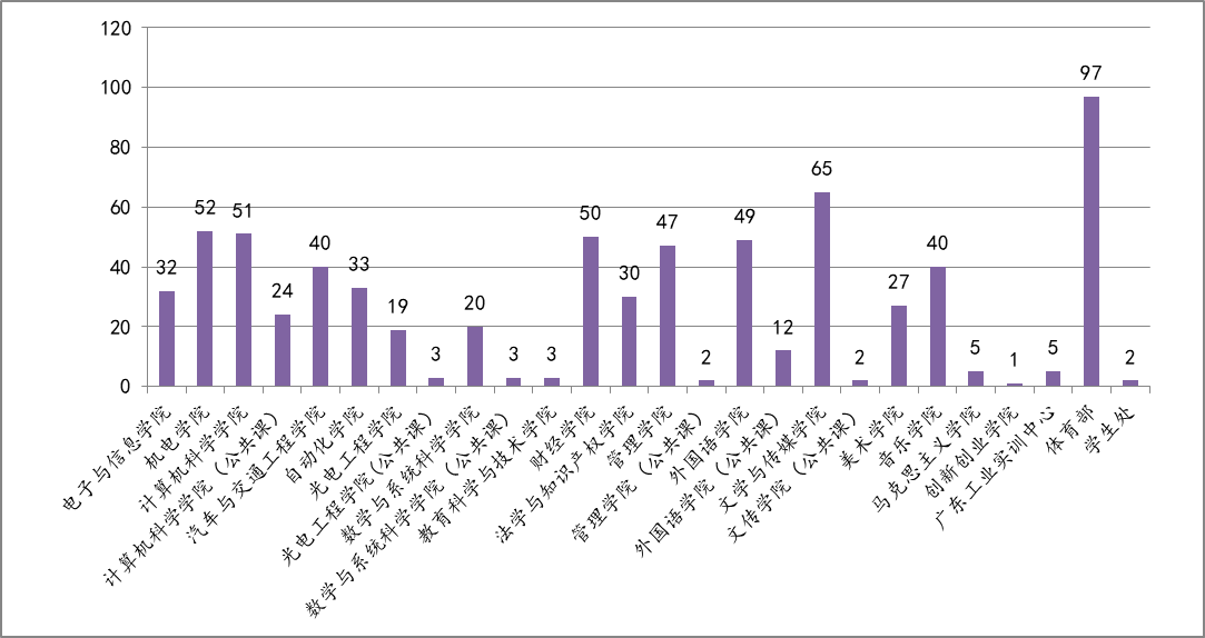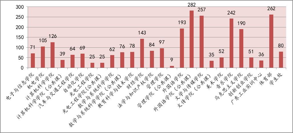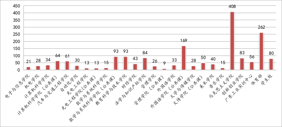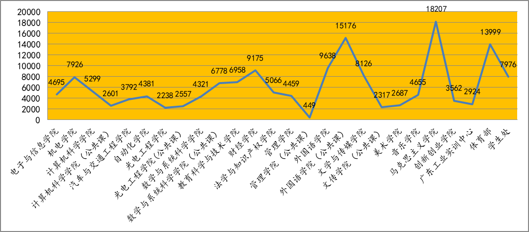 其中(见图11),外国语学院承担24814人次学生的教学任务,马克思主义学院承担了18207人次学生的教学任务,体育部承担了13999人次学生的教学任务。