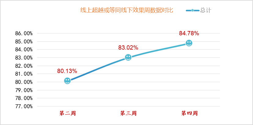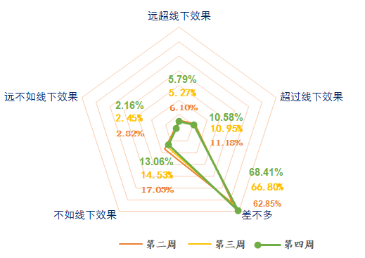 根据学生反馈数据显示(见图33),学生认为第四周线上学习效果超越或等同线下学习效果的总数据为84.78%,同比第三周(83.02%)上涨了1.76%,同比第二周(80.13%)上涨了4.65%。考虑到实训实验课程,统计有2.16%的学生认为线上学习远不如线下学习效果。线上学习开展4周能取得与线下效果差不多的效果,并且学习效果质量上升得益于线上教学能够打破时空限制,实现教学资源的共享,也得益于在全体师生的共同努力。