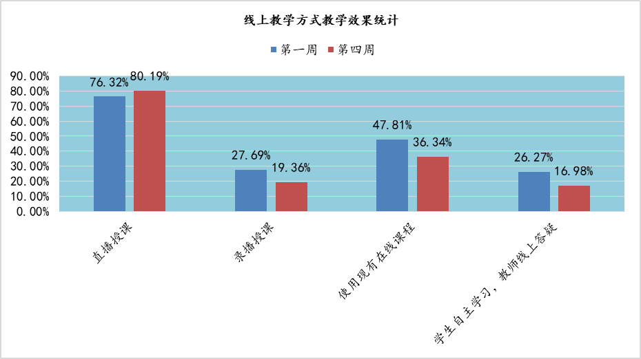 如图41所示,对比第一周和第四周学生教学信息员反馈情况,经过一个月的线上教学,师生熟悉掌握各教学平台及工具的功能后,80.19%的学生信息员认为直播授课的课堂效率更高;解决了网络卡顿的问题后,对于录播授课及教师答疑这类缺少师生直接互动的课堂教学方式,分别下降到了19.36%及16.98%,同时也有个别实训课程,因课程性质特殊,学生希望任课教师通过直播同时录像的方式开展教学,方便学生课后可根据自己学习情况回看视频开展自主学习;36.34%的课堂通过使用现有在线课程,开展研讨式教学,任课教授多种教学方式搭配使用,进一步提高了线上课堂教学效果。