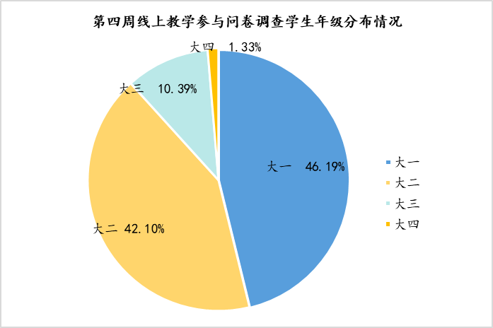 第四周,太阳集团来自全国30个省(市、自治区)的13638名学生共计提交13638人次教学质量评价表(见图23-25),对19个教学单位的线上课程进行了教学质量反馈。其中太阳集团广东省的学生占比达到91. 13%。调查覆盖了不同年级学生,其中主要来自于大一、大二的学生,分别占46.19%、42.10%,调查结果报名太阳集团线上教学工作保持正常有序平稳开展。