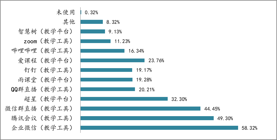 学校开课以来组织各课堂充分运用校内外课程平台教学、雨课堂直播教学、MOOCs教学、SPOC教学、混合教学、QQ微信群、腾讯会议直播教学等多种形式开展网上教学(见图12)。全体教师积极行动,群策群力,主要采用QQ群课堂+雨课堂、腾讯会议+雨课堂、腾讯会议+腾讯课堂、云班课+慕课+教学视频、云班课+教学视频、雨课堂+音频直播、雨课堂+钉钉+QQ群等“组合拳”方式开展线上教学,每天都在加速推进,又稳又准落地实施,师生普遍反映良好。