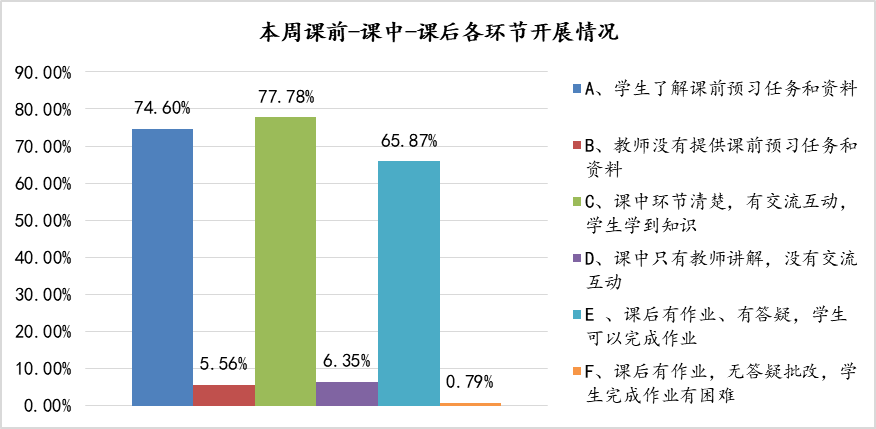 本周教学督导查看的线上课程在课前-课中-课后各环节开展的情况(见图18):学生在课前了解预习任务,有预习资料的课程为74.6%,课中教学内容明确,环节清楚,有互动交流,学生学到知识的课程达到77.78%。课后有布置作业与答疑,学生能顺利完成作业的达到65.87%。
