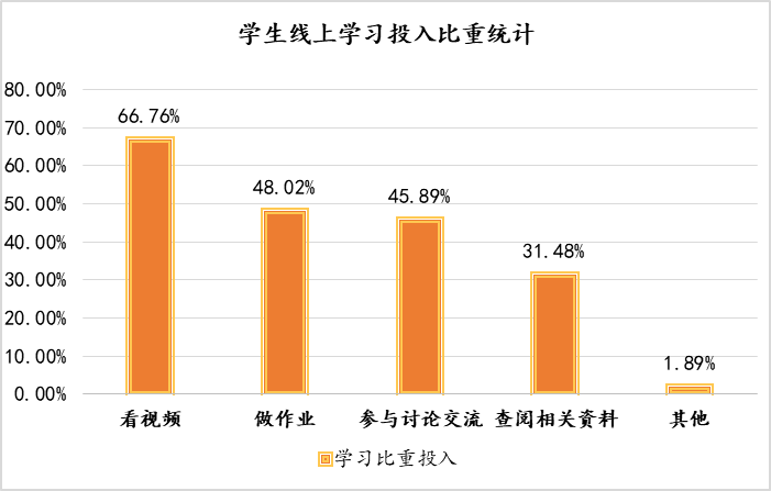 根据学生反馈数据显示(见图30),学生在线上教学单门课程中主要把更多的时间和精力花费在了看视频上,占比高达66.76%,其余做作业占比48.02%,参与讨论交流占比45.89%,查阅相关资料占比31.48%,教师可以根据学生反馈的投入比例进行相应的课程结构调整和安排,同时可以对侧重点进行及时合理规划。