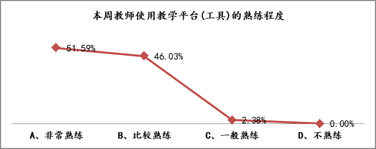 本周任课教师使用教学平台(工具)的技能越来越熟练,很多老师已经能够做到课前布置预习或是提供相关学习资料电子版,课中集中精力授课完成教学任务,熟练使用课堂互动工具了解学生学习状态,课后批阅学生提交的作业,查看讨论区并及时给与回应。如图19所示,51.59%的任课教师能够非常熟练使用教学平台(工具),比较熟练占46.03%,共计97.62%的任课教师达到了比较熟练及以上程度。