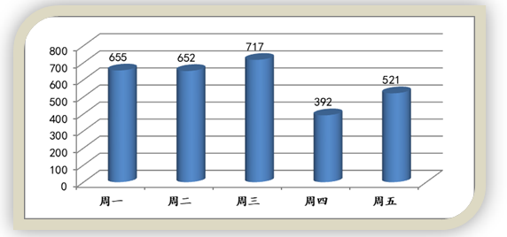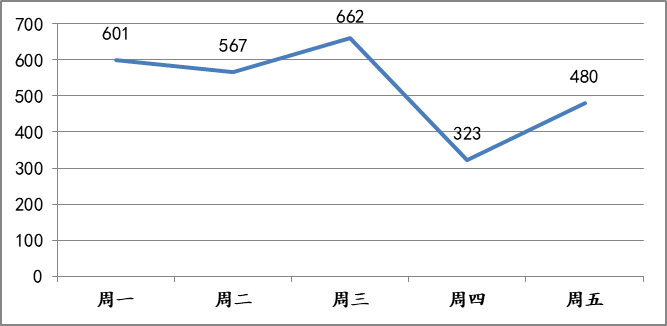 本周全校共开出2753门次课程(见图6)。其中,周一开出601门次课程,周二开出567门次课程,周三开出662门次课程,周四开出323门课程,周五开出480门次课程。