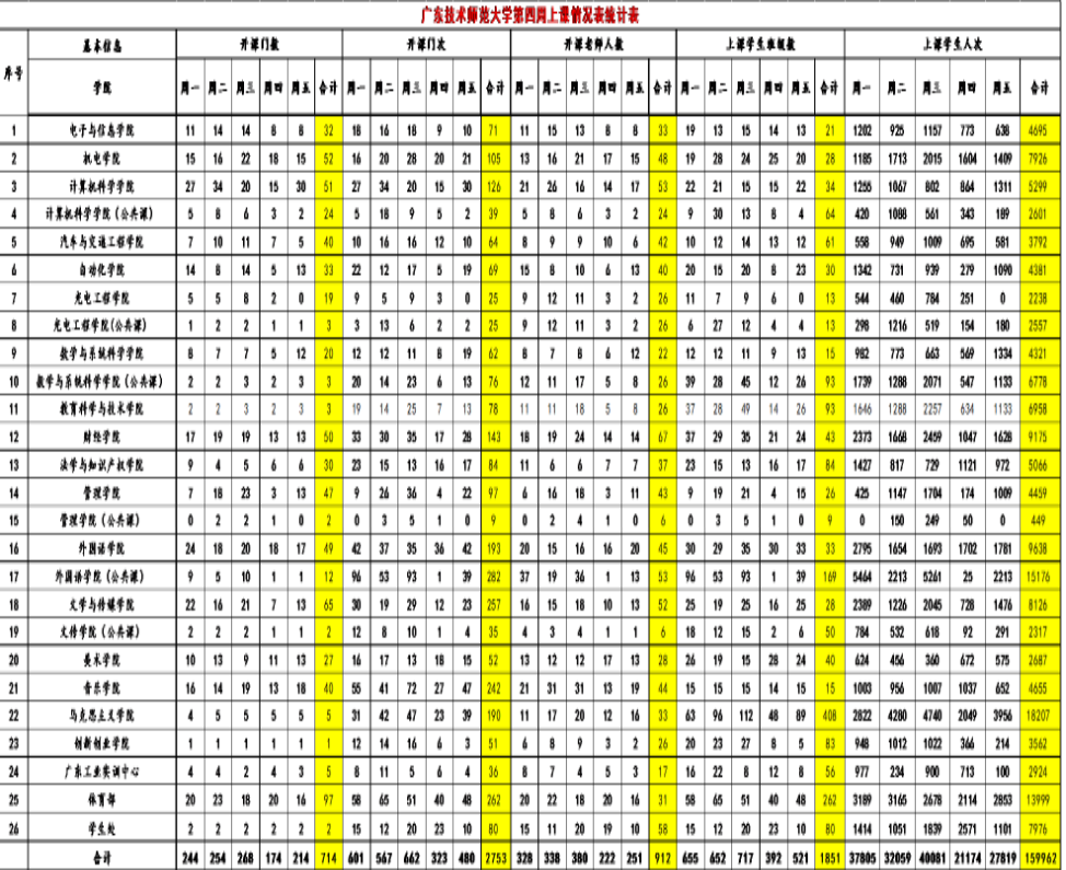 第四周,全校19个教学单位,912名教师开出714门课程、2753门次课程,1851个班级共计159962人次的学生参与线上学习,如图1所示。