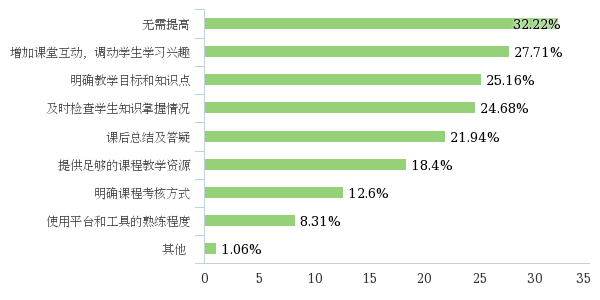 根据信息员反馈情况(见图42),有32.22%的课程学生认为任课教师已经做得很好无需提高,与对任课教师的满意度评价中的“全满分”的课程门次数比例基本一致。线上教学一个月后,学生对于课堂互动的渴望依然较高,有27.71%的课堂学生希望能够通过互动,调动学习兴趣;对于任课老师检查学生学习成效的关注也较高,有接近1/4的课堂需要任课教师在课堂上明确教学目标和知识点,能及时检查学生掌握情况,开展课后进行总结和答疑,进一步提升线上教学质量。