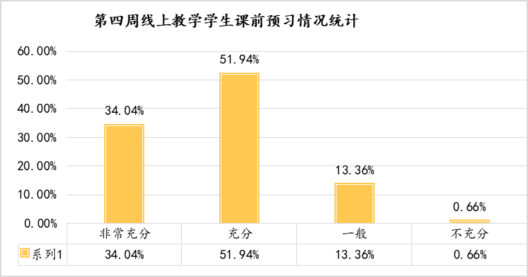 根据本周反馈的数据显示(见图26):34.04%的学生表示课前预习准备非常充分,51.94%的学生表示课前预习准备充分,充分情况达到85.98%,比上周的84.13%高出了1.85%,准备不充分的学生仅为0.66%。学生课前预习对于线上学习的质量起着正相关的影响,因此大部分学生课前预习准备充分也使线上教学开展达到了一个更好的效果。