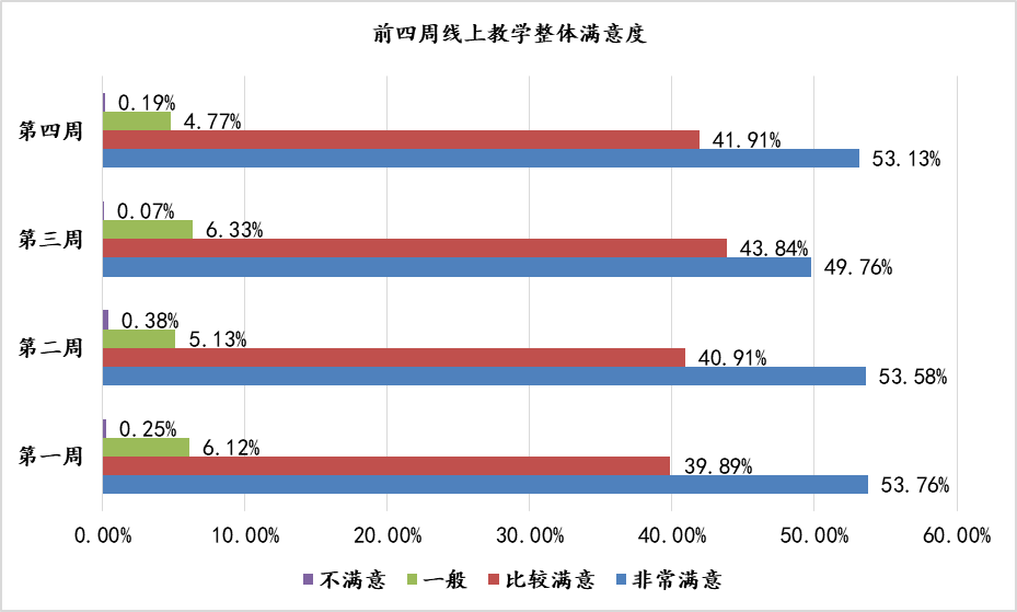 根据学生教学信息员提供的数据显示(见图43),本周课程的线上教学的整体满意度与前三周基本保持一致,其中,“非常满意”的课堂小幅回升至53.13%,前四周线上教学满意度的“优良率”平均达到94.2%,持续保持在较高水平。