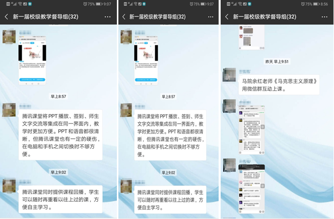 □ 计算机科学学院:建立多位一体的线上教学方案,建立课程群,方便师生交流、共享PPT、教材等资料;利用泛雅超新等平台上传提前录制好的教学视频、布置作业,方便没有电脑的学生进行移动学习和课堂讨论;利用腾讯企业微信、腾讯课堂等平台搭建教学直播平台,提高线上教学的有效性,多种方式保证线上教学的正常开展。本周系部主任、专业负责人、二级督导、辅导员、教务员根据线上工作领导小组分配的任务继续在相应的学习交流群进行监督。
