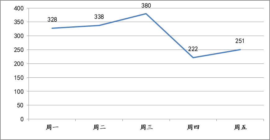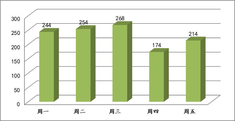 本周全校912名教师开展线上教学,有效保障教学秩序(见图2-3)。其中,周一有328名教师开展线上授课,周二有338名教师开展线上授课,周三有380名教师开展线上授课,周四有222名教师开展线上授课,周五有251名教师开展线上授课。